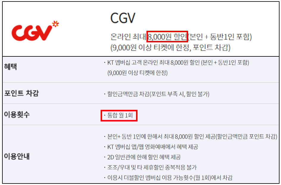 많은 사람들이 이용하는 CGV입니다. 8,000원이나 할인됩니다. 주의할 점은 통합 월 1회(맨 아래 '멤버십 컬처'를 제외한 한 곳에서만) 사용할 수 있다는 점입니다. 이번 달에 CGV에 더블할인 혜택을 썼다면 다시 CGV나 다른 곳에서도 혜택을 받을 수 없다는 말입니다.