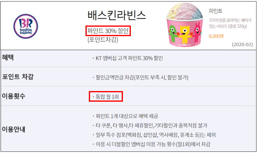맛있는 아이스크림이 31개나 있는 배스킨라빈스입니다. 그런데 파인트만 30% 할인입니다. 현재(20년 2월) 파인트가 8,200원이니깐 2,460원이 포인트로 차감되어 실제 돈은 5,740원만 부담하면 됩니다. CGV와 마찬가지로 통합 월 1회입니다. 아이스크림 좋아하시는 분들은 조금 아쉬울 수 있는 횟수입니다.