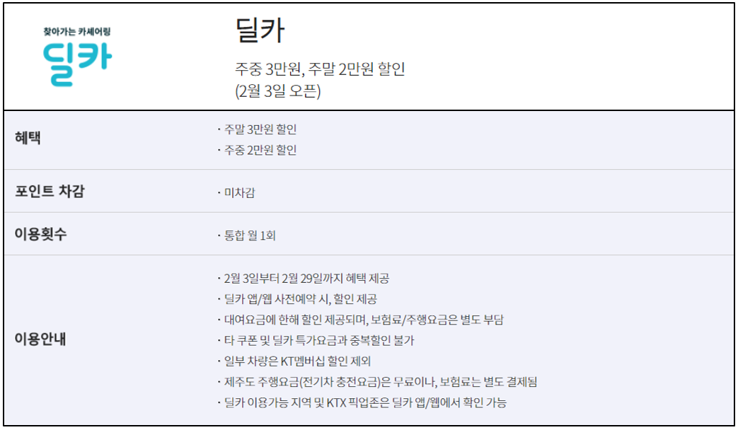 카셰어링 딜카입니다. 렌터카와 다르게 시간 단위로 예약할 수 있어 편리합니다. 딱 빌린 만큼만 비용을 내는 것이니 부담도 덜 할 것 같습니다. 3만 원, 2만 원이나 할인되면 상당히 좋아 보이는데요, 혜택을 못 받는 차량도 있나 봅니다. 사용할 때 유의하셔야 할 것 같습니다.
