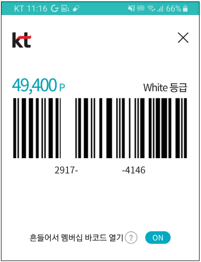 아 그보다 먼저! 본인의 멤버십 포인트와 등급을 확인하기 바랍니다. 휴대폰이나 KT 홈페이지(kt.com)에서 확인할 수 있습니다. 아래는 제 휴대폰으로 본 포인트(49,400)와 등급(White)입니다.