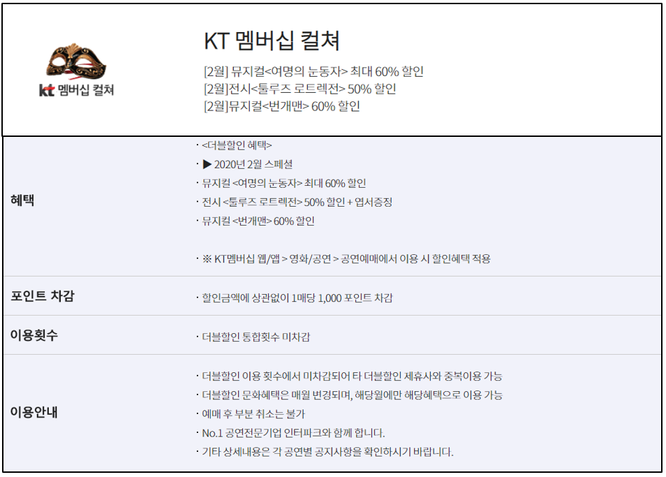 공연은 매월 바뀐다고 하니, 관심 있으신 분들은 찾아보셔야 할 것 같습니다. 혜택 정도는 굉장히 큽니다. 50~60%나 할인됩니다. 포인트도 1,000밖에 삭감 안 되네요. 그리고 더블할인 횟수 제한이 없습니다... 더블할인 이름을 왜 붙였는지는 모르겠지만요.