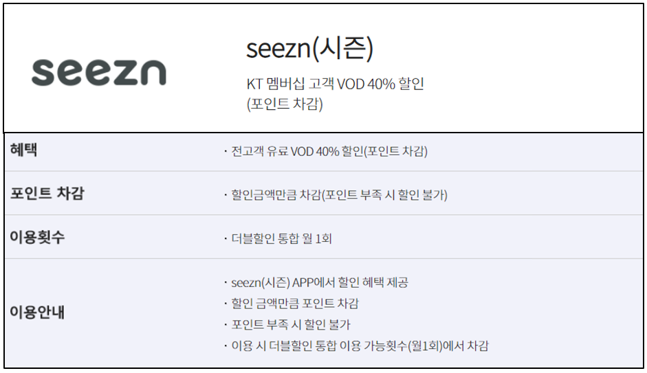 동영상 VOD 서비스 seezn(시즌)입니다. 원래 상시 할인이 20%인데 더블할인으로 VOD를 40% 할인된 가격으로 볼 수 있습니다. 이것도 통합 월 1회입니다.