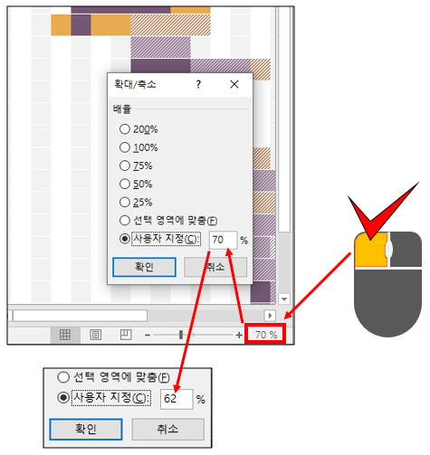 엑셀 창 우측 하단에 70%에 커서를 가져가서 [왼쪽 마우스]를 눌러줍니다. 그러면 '확대/축소'창이 나타납니다. 70이 적힌 흰색 칸에 62를 타이핑하고 엔터를 치면,